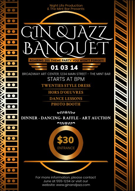 Add a valuable accessory to your promotions with the Twenties Postcard. Printed on high quality card stock, this elegant design features shimmering gold details framing all your party details. Send to your guest list or leave with participating businesses to find new guests!